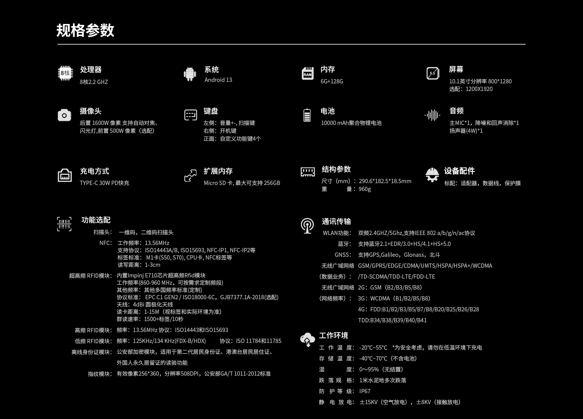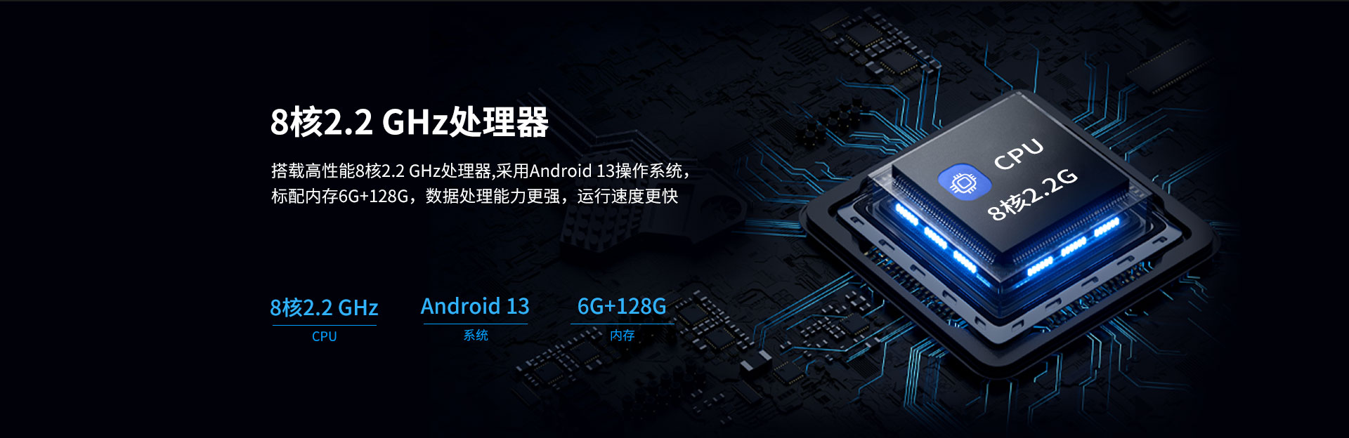 Y100三防平板电脑搭载高性能8核2.2 GHz处理器,采用Android 13操作系统,标配内存6G+128G,数据处理能力更强,运行速度更快