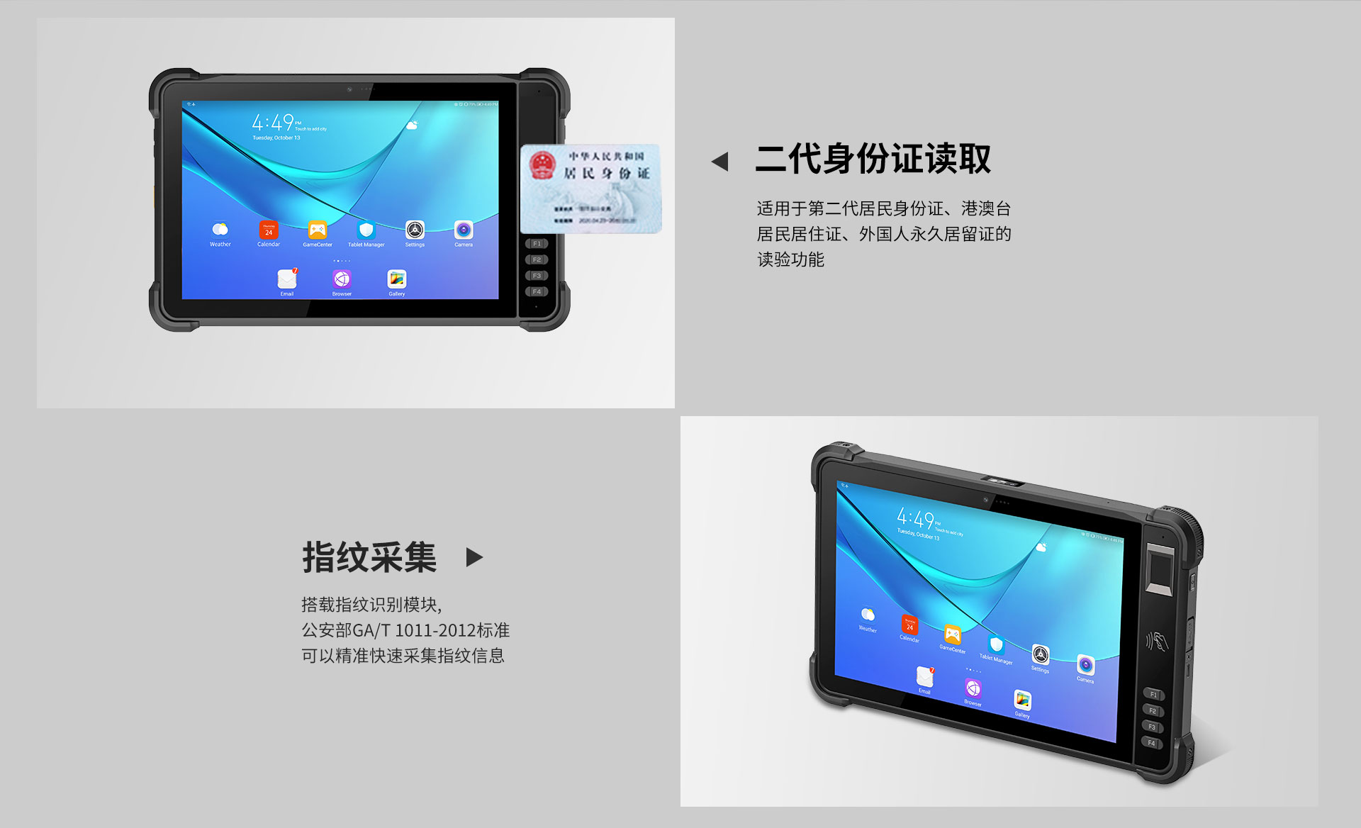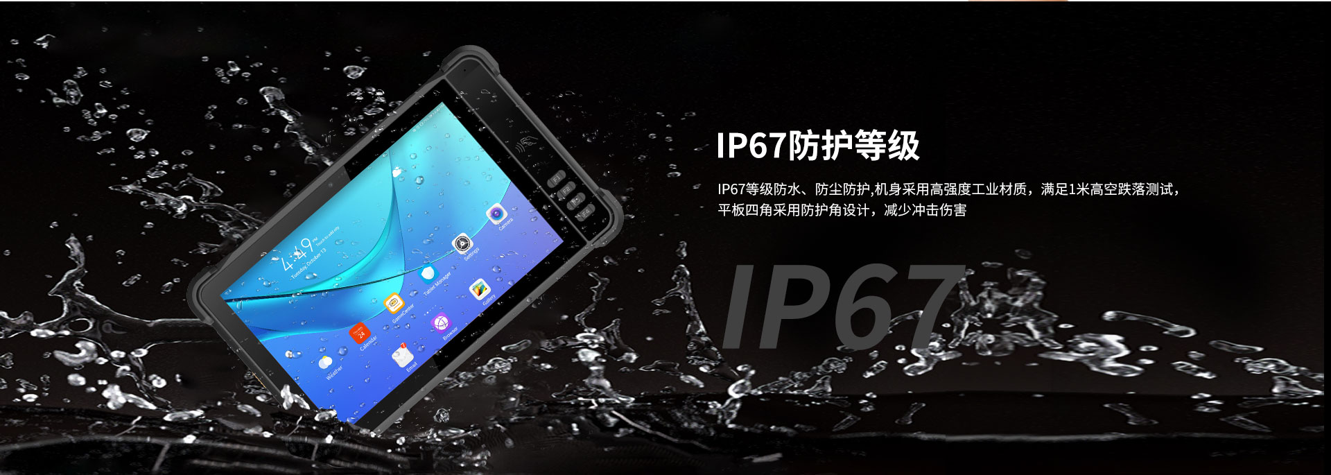 IP67等级防水、防尘防护,机身采用高强度工业材质,满足1米跌落测试,平板四角采用防护角设计,减少冲击伤害