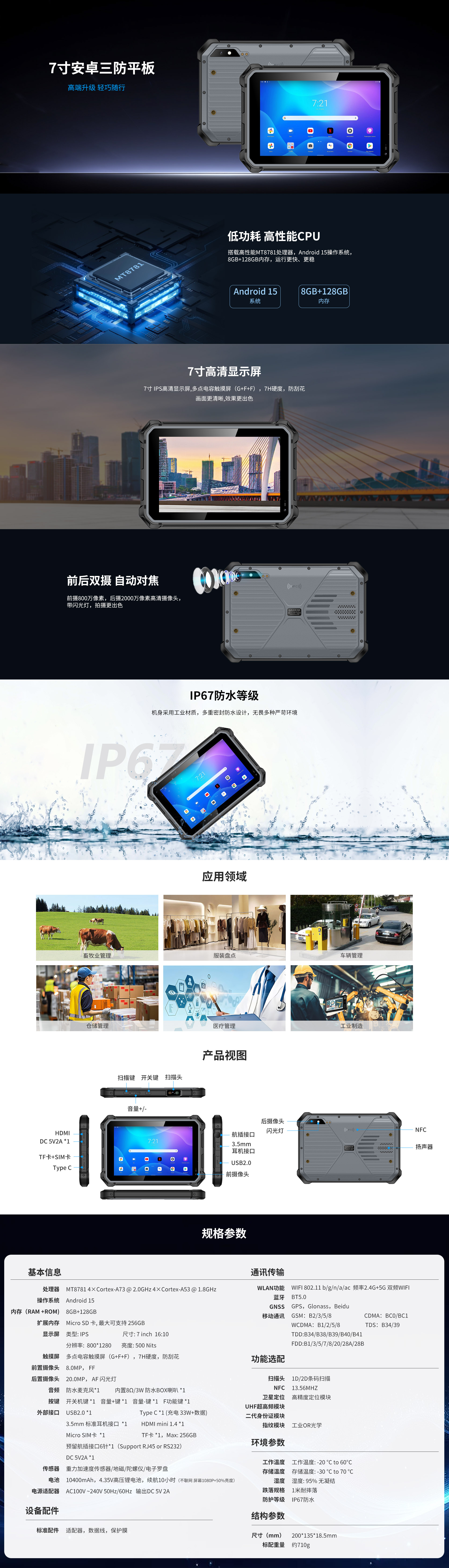 Y70是联强优创自主研发一款多功能7寸安卓三防平板电脑。7寸高清显示屏,搭载高性能MT8781 4×Cortex-A73 @ 2.0GHz 4×Cortex-A53 @ 1.8GHz处理器。Android 15操作系统,标配内存8GB+128GB,内置10400mAh锂电池,IP67防护等级。