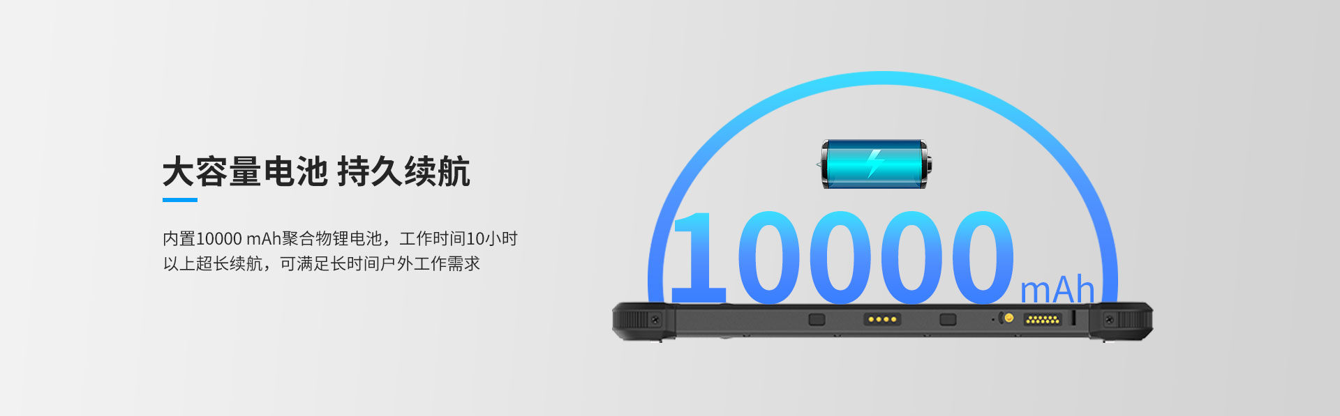 内置10000 mAh聚合物锂电池,工作时间10小时以上超长续航,可满足长时间户外工作需求