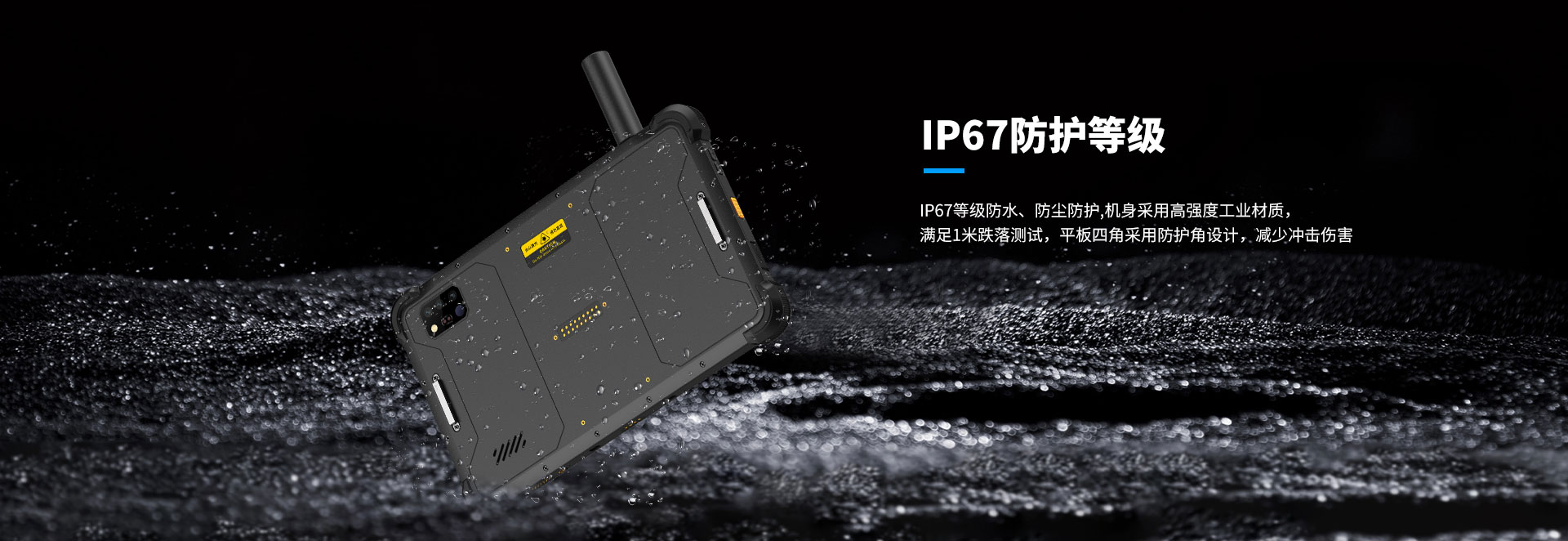 IP67等级防水、防尘防护,机身采用高强度工业材质满足1米跌落测试,平板四角采用防护角设计,减少冲击伤害