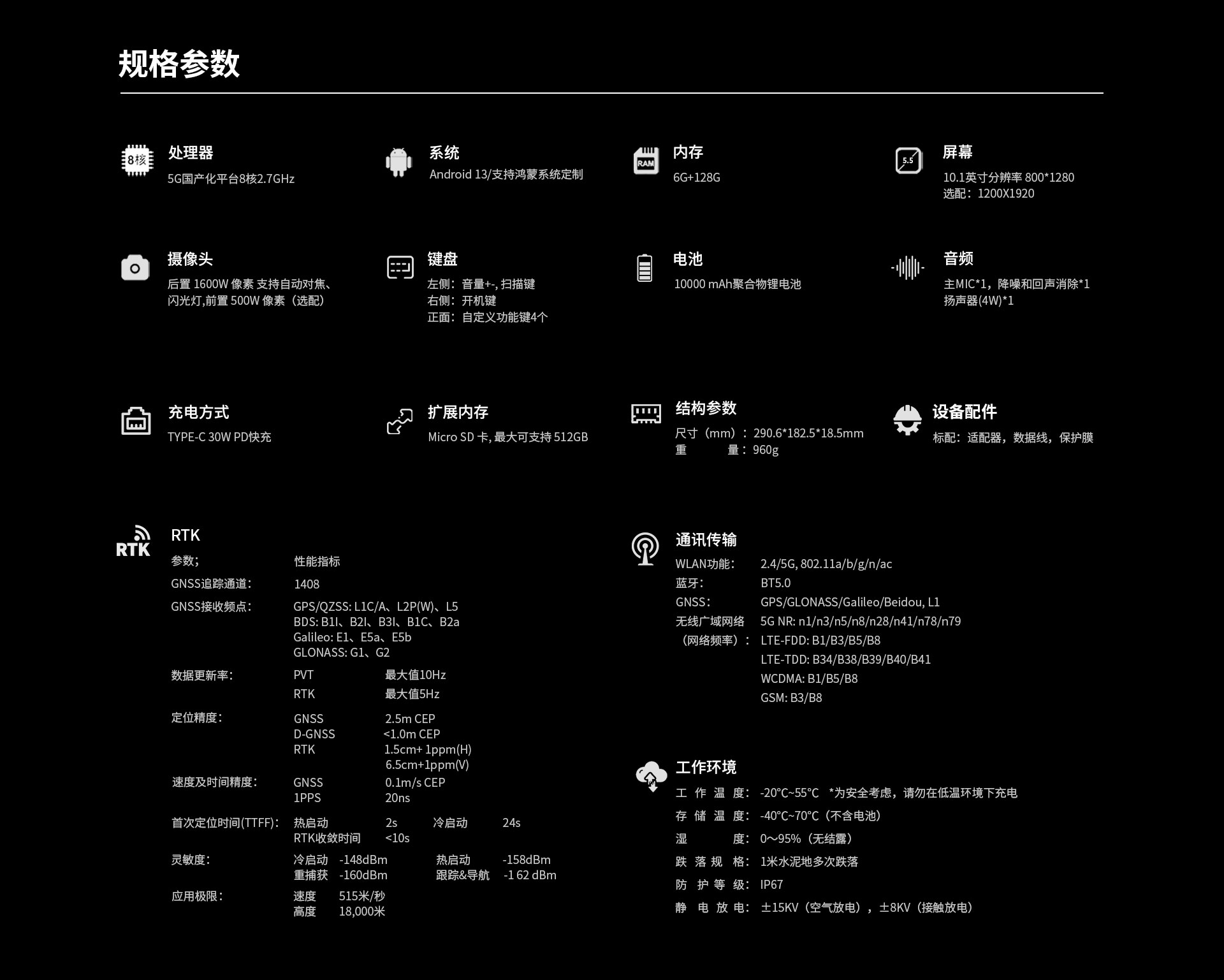 Y100-RTK(5G)是联强优创自主研发一款高精度RTK定位三防平板电脑。10.1寸高清大屏,搭载高性能处理器,5G国产化平台8核2.7GHz。Android 13操作系统,支持国产鸿蒙系统定制;标配内存4G+128G,选配:6G+128G;8G+128G,8G+256G,配备10000mAh的大容量电池。内置RTK算法,支持厘米级的精度,集成高精度GNSS定位板卡,四臂螺旋天线,IP67防护等级,行业适应性强,广泛适用于国土、电力、林业、 环保、 公路、铁路、船舶监控、石油燃气管道、矿界勘察等应用领域。